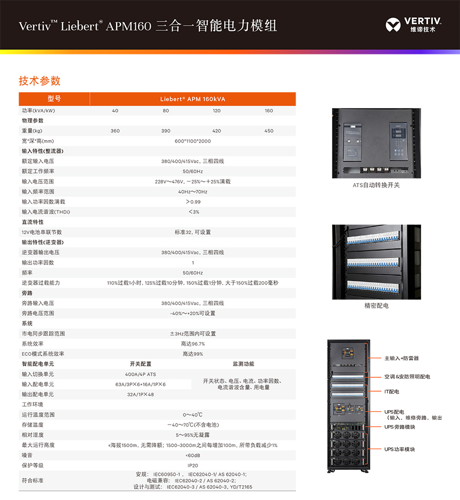 特性 工程产品化,加速现场部署 一体化集成输入配电、UPS、输出精密配电,实现“三柜融合”, 占地节约 67%,施工工时大幅降低; 极致可靠 UPS 功率模块并联采用独创的母排并联技术,具有更好的系统均流特性; 增强型安规防护设计及严苛的湿尘环境测试,提升产品可靠性; 输入、输出布线分区独立,避免交叉走线带来的安全隐患; 设备可视化,简便系统运维 输入配电,UPS,制冷,安防,照明配电在9寸触屏集中显示,简单直观; 集成统一的监控组网接口,实现平滑接入远程监控运维平台; 配电智能化,精细管理负载 内置智能配电管理系统,可检测输出每一路分支开关状态,电压,电流,功率因数,电流谐波含量和用电量; 高效节能 双变换效率高达 96.7%,25% 负载效率>95.5%; 支持智能休眠, 提升轻载运行效率; 灵活部署 内置精巧的 40kVA/40kW 功率模块,高度3U; 系统容量支持分期部署,降低用户初始投资成本; 功率模块,旁路模块均可快速更换,便于维护; 风格IT化,无缝衔接机房设备 配合维谛技术 Smart Solution,统一的 IT 机柜造型设计,外观、尺寸、机械节点 平滑过渡和衔接,打造完美整体解决方案
