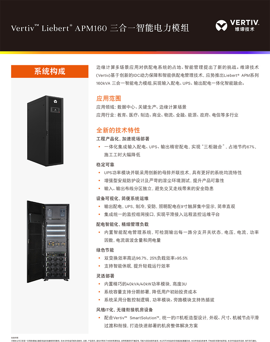 边缘计算多场景应用对供配电系统的占地、智能管理提出了新的挑战。 维谛技术基于业内领先的IDC动力保障和智能供配电管理技术,应势推出 Liebert® APM 系列 160kVA 三合一智能电力模组,实现输入配电、UPS、输出配电一体化智能融合。APM160实现了工程产品化,加速现场部署。内部采用独创的母排并联,输入,输出布线分区独立等设计实现产品极致可靠。 APM160高效节能,灵活部署,设备可视化,风格IT化,无缝衔接机房设备,打造完美一体化解决方案。